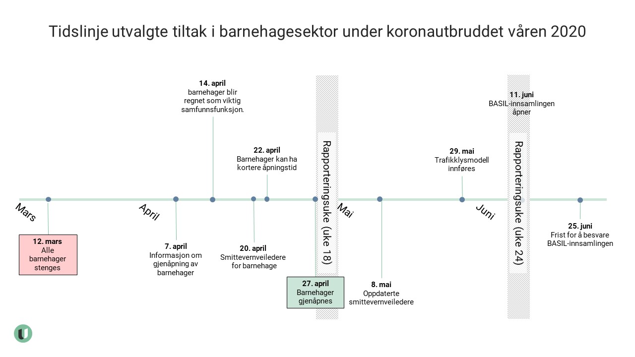 Tidslinje over tiltak i barnehagesektor, våren 2020