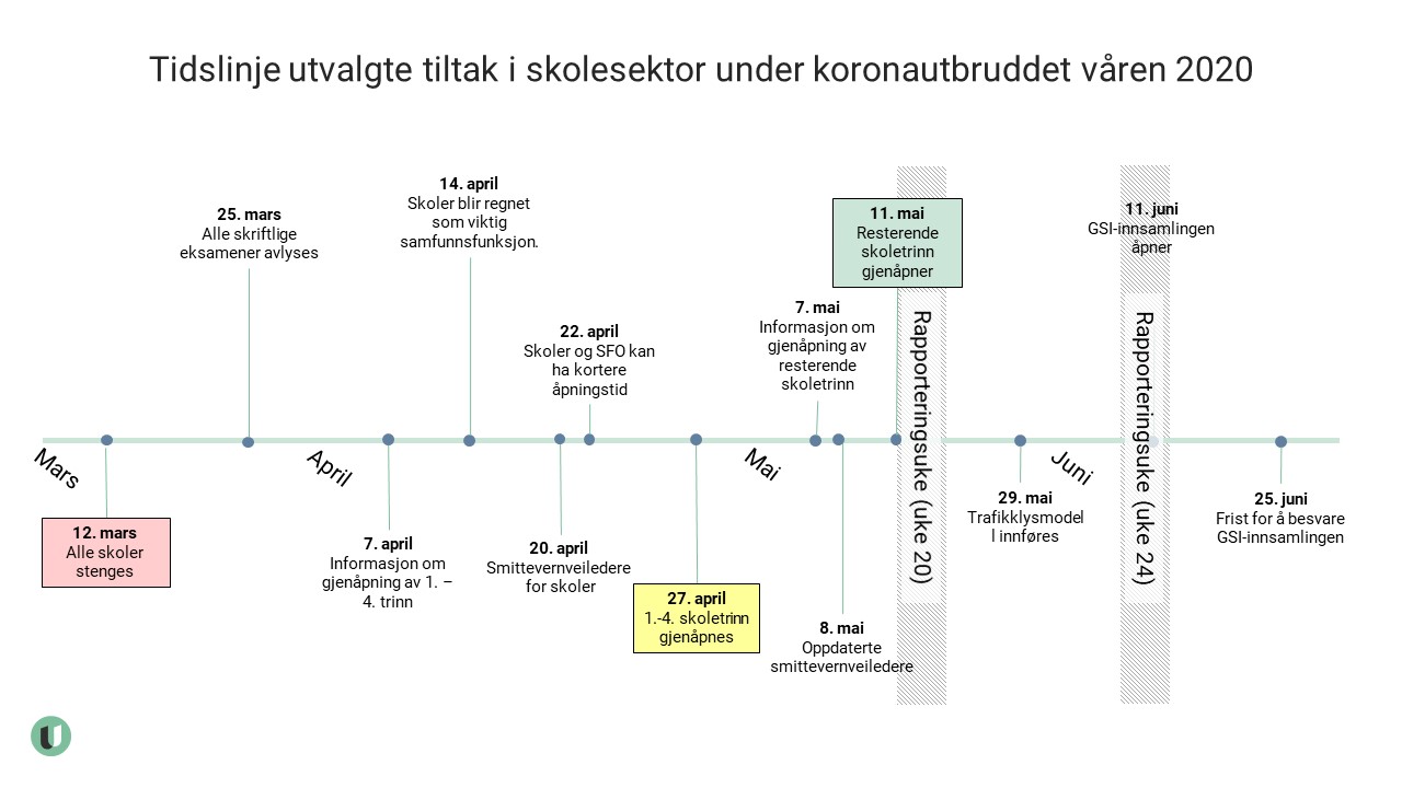 For å få bedre innsikt i hvilke konsekvenser smitteverntiltakene hadde for tilbudet i barnehager, grunnskoler og voksenopplæring, ble det i juni 2020 gjennomført flere ekstraordinære innrapporteringer i regi av Utdanningsdirektoratet, både for grunnskoler, barnehager og grunnskoleopplæring for voksne.