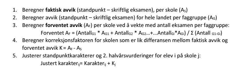 Dersom det er ulik karakterpraksis ved de ulike skolene, vil dette kunne påvirke resultatene i stor grad. Vi har derfor valgt å justere karakterene basert på avviket mellom standpunktkarakter og skriftlig eksamenskarakter. Dette gjør vi ved å legge til et korreksjonsledd. Korreksjonsleddet beregnes ved å sammenligne det gjennomsnittlige avviket mellom standpunktkarakter og skriftlig eksamenskarakter for en skole, med et forventet gjennomsnittlig avvik mellom standpunktkarakter og skriftlig eksamenskarakter for skolen, hvor det er tatt hensyn til hvilke eksamener elevene var oppe i. For grunnskolekarakterer er dette relativt enkelt. Det er få eksamensfag (sammenlignet med Vgo) og alle skal opp i minst én av tre sentralt gitte eksamener. På videregående skoler er det mer utfordrende. Det er få elever som trekkes ut til skriftlig eksamen per fag, særlig på yrkesfag, og dette gir et dårligere grunnlag for justering. Dette har vi forsøkt å løse ved å samle fagene med få avlagte eksamener i ulike faggrupper. De største fagene, som for eksempel norsk hovedmål Vg3 skriftlig, utgjør en egen faggruppe, mens mindre eksamensfag grupperer vi i faggrupper basert på faglige fellestrekk. Metoden vi har brukt for å justere kan beskrives på følgende måte: